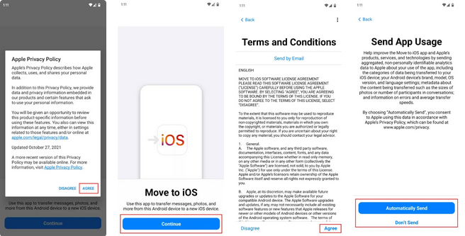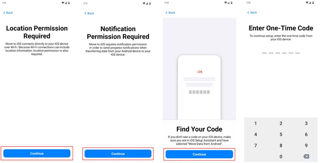 - برنامه را باز کرده و پس از موافقت با شرایط برنامه، مجوزهای لازم را به Move to iOS بدهید تا به صفحهی مربوط به درج کد درخواست برسید. در این صفحه روی Continue ضربه بزنید و دستگاه اندرویدی خود را کنار بگذارید.