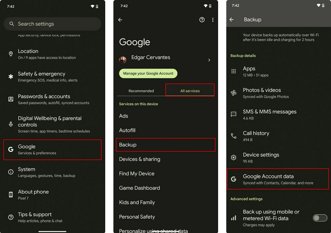- روی Google Account data (اطلاعات حساب گوگل) ضربه بزنید.