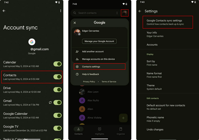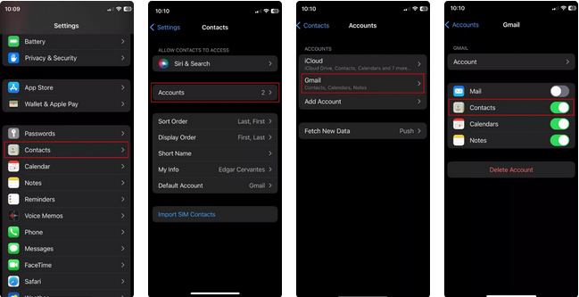 - حساب جیمیل خود را انتخاب کرده یا آن را اضافه کنید. مطمئن شوید که گزینهی Contacts روشن باشد.