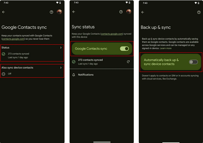 - گزینهی Automatically back up & sync device contacts (پشتیبانگیری و همگامسازی خودکار مخاطبین دستگاه) را روشن کنید.