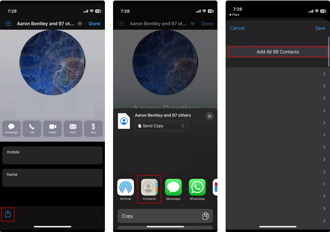 - برنامه Contacts را انتخاب کنید و روی Add All Contact ضربه بزنید.