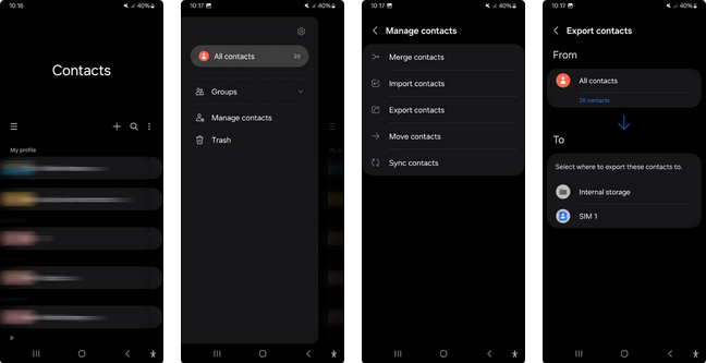 ما در ادامه، مراحل انتقال مخاطبین به سیمکارت را با گوشی سامسونگ پیش میبریم و ممکن است برخی از این مراحل در گوشی شما متفاوت باشد. درصورتیکه گوشی شما از این قابلیت پشتیبانی نمیکند، میتوانید از اپلیکیشنهای کپیکردن مخاطبین روی سیمکارت در گوگلپلی استفاده کنید.