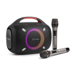 - دو میکروفون شارژی: این اسپیکر با دو میکروفون شارژی ارائه میشود، که به شما امکان میدهد همزمان از صدای خود لذت ببرید و با دیگران به راحتی گفتگو کنید. میکروفونهای شارژی، شما را از نگرانی بابت کابلها رها میکنند و آزادی عمل بیشتری به شما میدهند.
