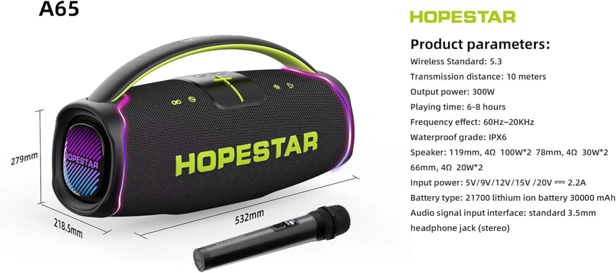– توان خروجی 300 وات: اسپیکر هاپ استار A65 با توان خروجی فوقالعاده 300 وات، صدایی واضح و بلند را ارائه میدهد که هر فضایی را پر از موسیقی میکند. این اسپیکر به راحتی میتواند شما را در مهمانیها و جمعهای دوستانه غرق در لذت کند.