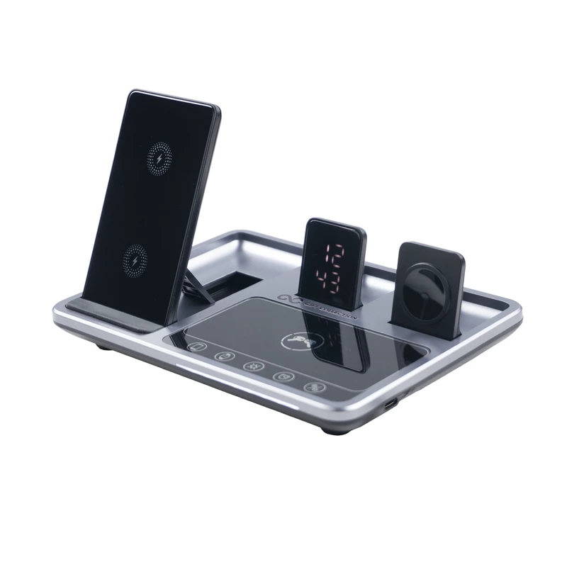 – دکمه‌های لمسی و تغییر حالت: با وجود 5 دکمه لمسی، شما می‌توانید داکت شارژ موبایل و ساعت و ساعت دیجیتالی را به راحتی از حالت افقی به ایستاده تغییر دهید. این کار به کمک موتور جک الکتریکی در دستگاه انجام می‌شود، که کارایی و سهولت استفاده را افزایش می‌دهد.