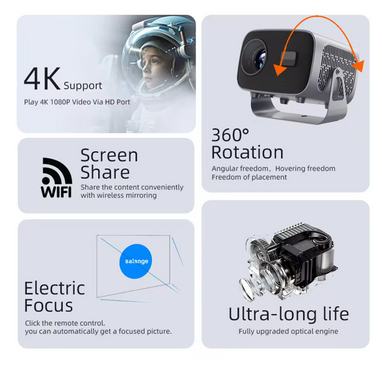 - حافظه داخلی و اتصال بیسیم: با داشتن 8 گیگابایت حافظه RAM و 1 گیگابایت حافظه ROM، این دستگاه گزینه مناسبی برای پخش محتوا بهصورت بیوقفه است. همچنین، Wi-Fi داخلی و بلوتوث به شما این امکان را میدهد که به آسانی گوشیهای اندرویدی و آیفون خود را به پروژکتور متصل کرده و تصویر آنها را بر روی پرده یا دیوار نمایش دهید.