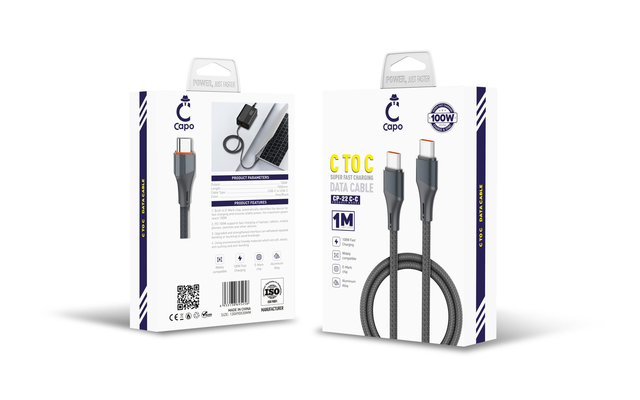 کابل شارژ دو سر تایپ سی 100 وات کاپو CAPO CP-22